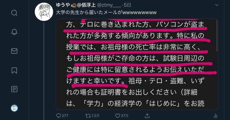 教授から学生に届いた注意メールが話題 お祖母様が存命の場合 試験日周辺のご健康には特に留意を まいどなニュース